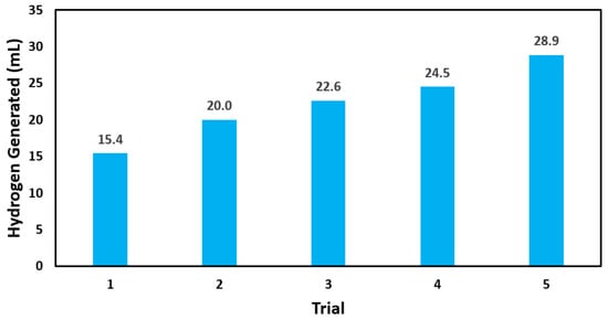 Figure 10 displayed the catalytic reusability of our BCD-AuNPs. The average volume of hydrogen generated across the five trials was 22.3 mL. It was observed that the catalyzed ability of BCD-AuNPs was not diminished with additional uses. The increasing trend of the hydrogen generation could be due to the effect of BH4 and H− formed strong bonds on the surface of gold nanoparticles, and then over a long period time, these bonds become hydrolyzed and improve the electrostatic stabilization of the AuNPs surface making them more active []. These results indicated that BCD-AuNPs are durable and have a potential recyclability for application in hydrogen economy.