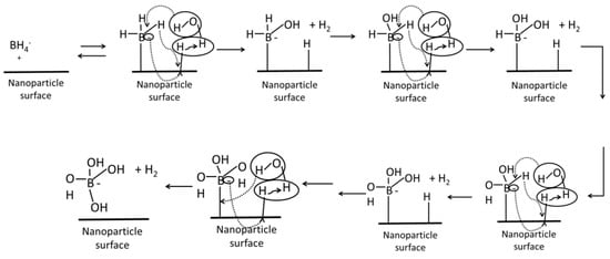 The proposed mechanism in Scheme 1 is based on the Michaelis–Menten model for the catalytic hydrolysis of sodium borohydride (Equations (3) and (4)). This mechanism occurs on the nanoparticle surface due to the reaction requiring two metal sites per molecule of borohydride. The borohydride ions anchor on the nanoparticle surface and attracted the hydroxyl group of water molecules. The hydrogen ion is released and combines with free ions. The role of both the occupied and unoccupied catalytic sites is depicted in Scheme 1, and it highly suggested that the dispersion of nanoparticles helps to increase the active surface area. This may offer an explanation to the trends seen in Figure 6, where the gold performed best at the higher concentration due to the increased number of BH4− attached on the surface of nanoparticles. It should be noted that the mechanism is a multi-electron process between two potential active sites, and thus the catalytic ability of the material to move electrons between adjacent sites is believed to be another important characteristic of a successful catalyst.