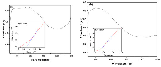 where hv is the photon energy, α is the absorption coefficient i.e., , and β is the band edge. The n value can be 2 or 0.5 for a direct or indirect transition, respectively [46]. The values for the optical band gaps were found to be 1.34, 1.38, 2.14, and 2.20 eV for Cu31S16 (120 °C), (b) Cu31S16 (150 °C), (c) Cu7S4 (220 °C), and (d) Cu7S4 (250 °C), respectively (inserts). These values are comparable to other similar studies [47,48] and also indicated a shift to a shorter wavelength compared to the band-gap energy of their bulks [44,49].