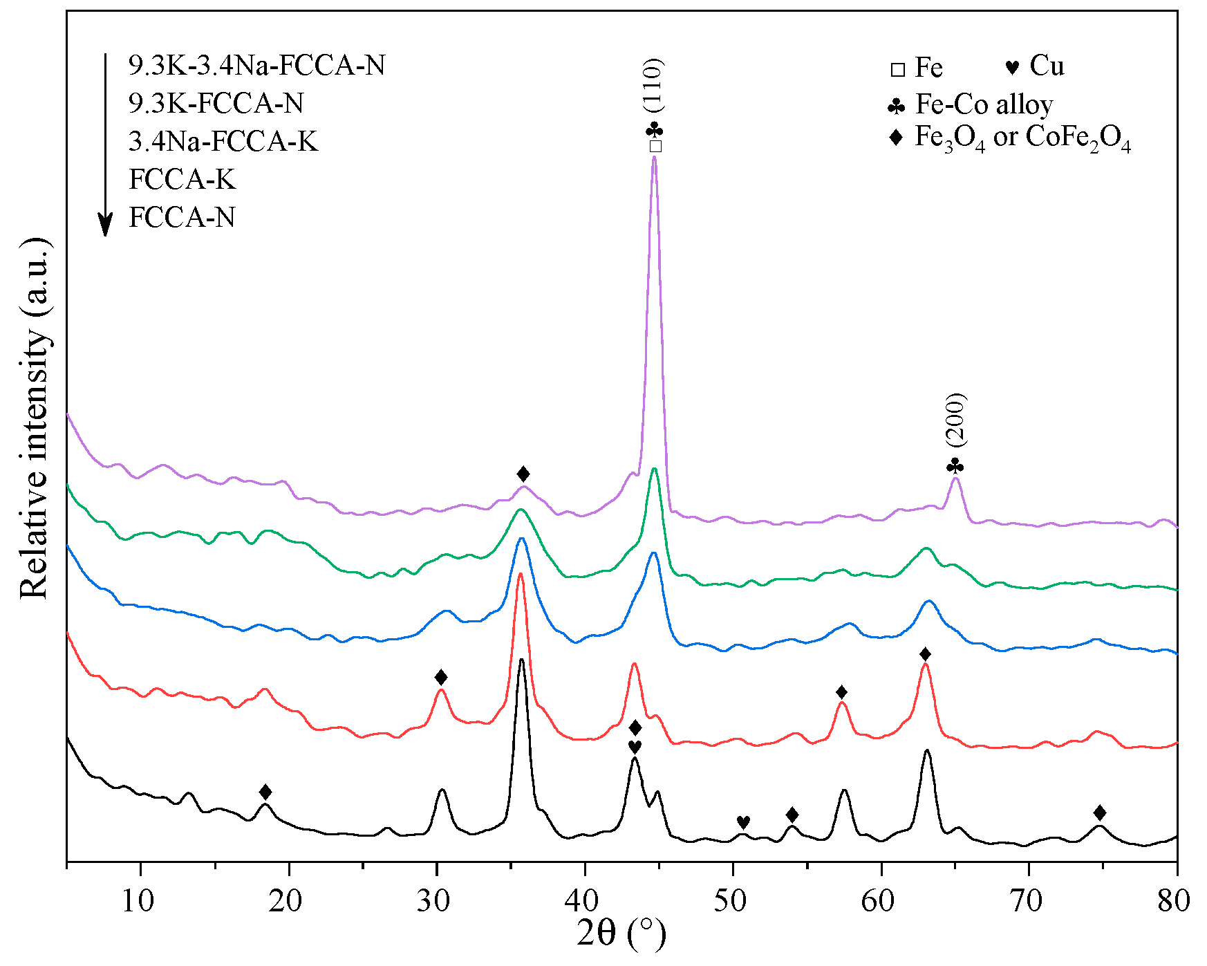 The obtained FeCoCuAl catalyst, using sodium alkali as a precipitant, was found by ICP-OES to contain low residual Na with a Na/Fe molar ratio of 0.16%, and using potassium alkali as a precipitant gives a residual amount of K of the K/Fe molar ratio of 0.18%. From Table 1, the BET specific surface area, pore volume and average pore diameter of FeCoCuAl oxide catalysts obtained by using Na alkali solution (NaOH-Na2CO3) are bigger than those with K alkali solution (KOH-K2CO3) as a precipitant. At the same time, it is clear that Na modification can further increase the BET specific surface area, pore volume and average pore diameter of FeCoCuAl catalysts. K modification has a reverse function, which can be also proved by N2 adsorption-desorption results of FeCoCuAl catalysts with different K and/or Na amount (see Tables S1 and S2 in Supplementary Materials). This mainly because the Na ion has a small ionic radius and easily occupies macropores to form new micropores, providing a larger surface, which can be proved by the decrease in the average pore diameter. However, the introduced K ions with a bigger ionic radius possibly block pores, especially some micropores.