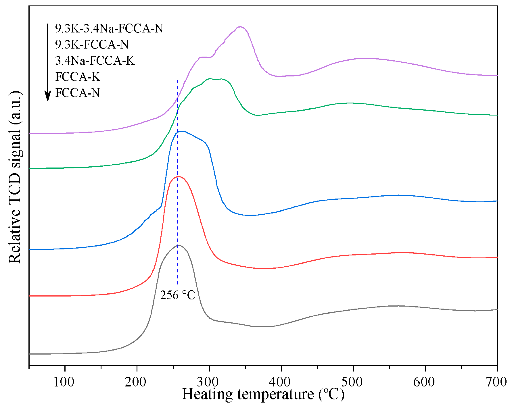 As shown in H2-TPR profiles of FeCoCuAl catalysts (Figure 2), both FCCA-N and FCCA-K exhibit a sharp reduction peak at about 256 °C, which is perhaps from H2 consumption due to the reduction of Cu2+ → Cu0 [31], Fe3+ → Fe2+ [32] and Co3+ → Co2+ [33]. Additionally, these reduced Fe and Co species are highly dispersed due to ready occurrence of their reduction only at a low temperature. When the Na promoter is introduced into FCCA-K, this reduction peak becomes broad and slightly shifts to a high temperature. This is mainly because the presence of Na ions promotes the reduction of iron and cobalt oxides to a metallic state. Moreover, the modification of K and K-Na can further make the reduction peak broader and shift to a higher temperature. Additionally, the simultaneous introduction of K and Na brings forth a new broad reduction peak near 500 °C, which is possibly from the reduction of iron and cobalt species in CoFe2O4. These results indicate that Na and K modification is beneficial to the easy reduction of Fe2+ and Co2+, forming metallic Fe and Fe-Co alloy, which can be further proved by H2-TPR profiles of FeCoCuAl catalysts with different K and/or Na amount (see Figures S4–S6 in Supplementary Materials). The improvement order is Na < K < K-Na modification. From H2-TPR results, it can be proved that Cu0 crystal core should be produced first, and followed by the formation of Fe@Cu and Fe-Co@Cu crystals during reduction by H2, in agreement with the above XRD results.