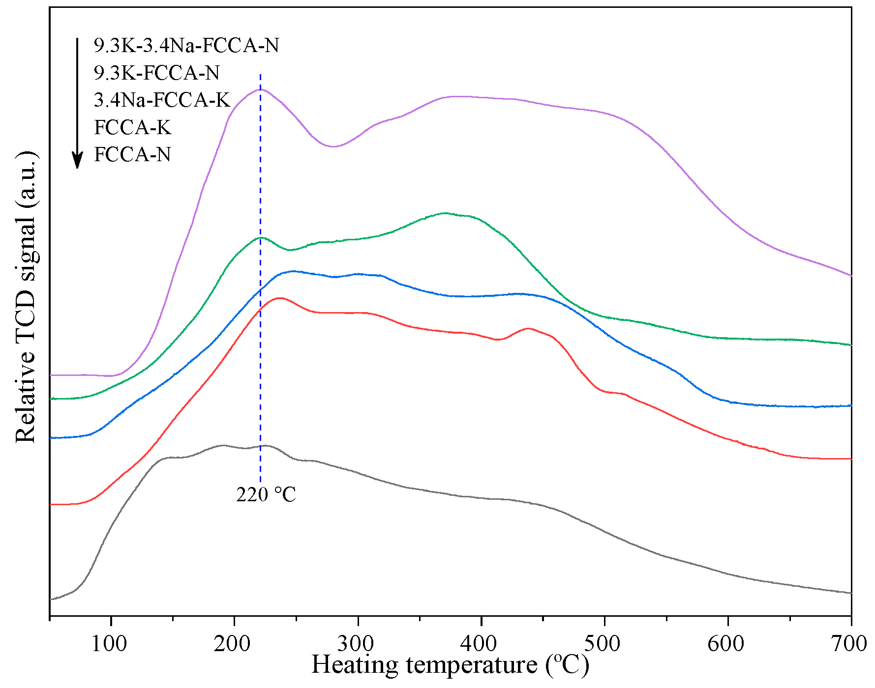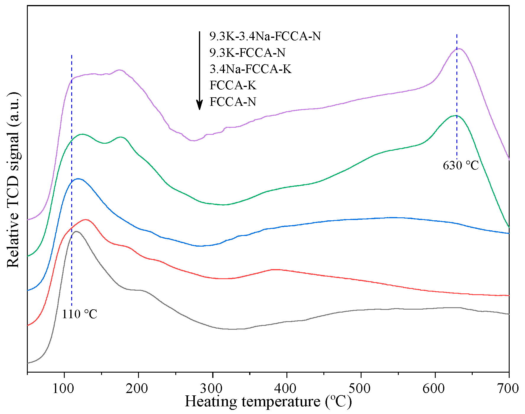 CO2-TPD results (Figure 4) indicate that all reduced FeCoCuAl catalysts exhibit a CO2 desorption peak at 110 °C, which is attributed to weakly adsorbed CO2. Meanwhile, it can be observed that Na-modified FCCA-K shows a new and weak CO2 desorption band at 350–600 °C, along with a slight shift to a low temperature. This shows that the introduced sodium promoter can provide more base sites. K- and K-Na-promoted samples exhibit two obvious new CO2 desorption peaks at about 180 °C and 630 °C, respectively. The similar results are also observed from CO2-TPD results of FeCoCuAl catalysts with different K and/or Na amount (see Figures S10–S12 in Supplementary Materials). The former is attributed to CO2 weakly adsorbed on moderate base sites. Additionally, the latter should be from the decomposition of bidentate carbonate species produced by the strong interaction between CO2 and potassium or sodium ferrite (K2Fe2O4 or Na2Fe2O4) with strong base sites [19]. This is because the alkali K+ possesses a stronger alkalinity than Na+. For the same reason, the introduction of alkali metal ions can lead to the formation of electron-rich Fe@Cu and Fe-Co@Cu alloy crystals, which can also activate CO2 molecules. All these data show that simultaneous promotion of K and Na exhibits a synergistic effect when activating H2 and CO2.