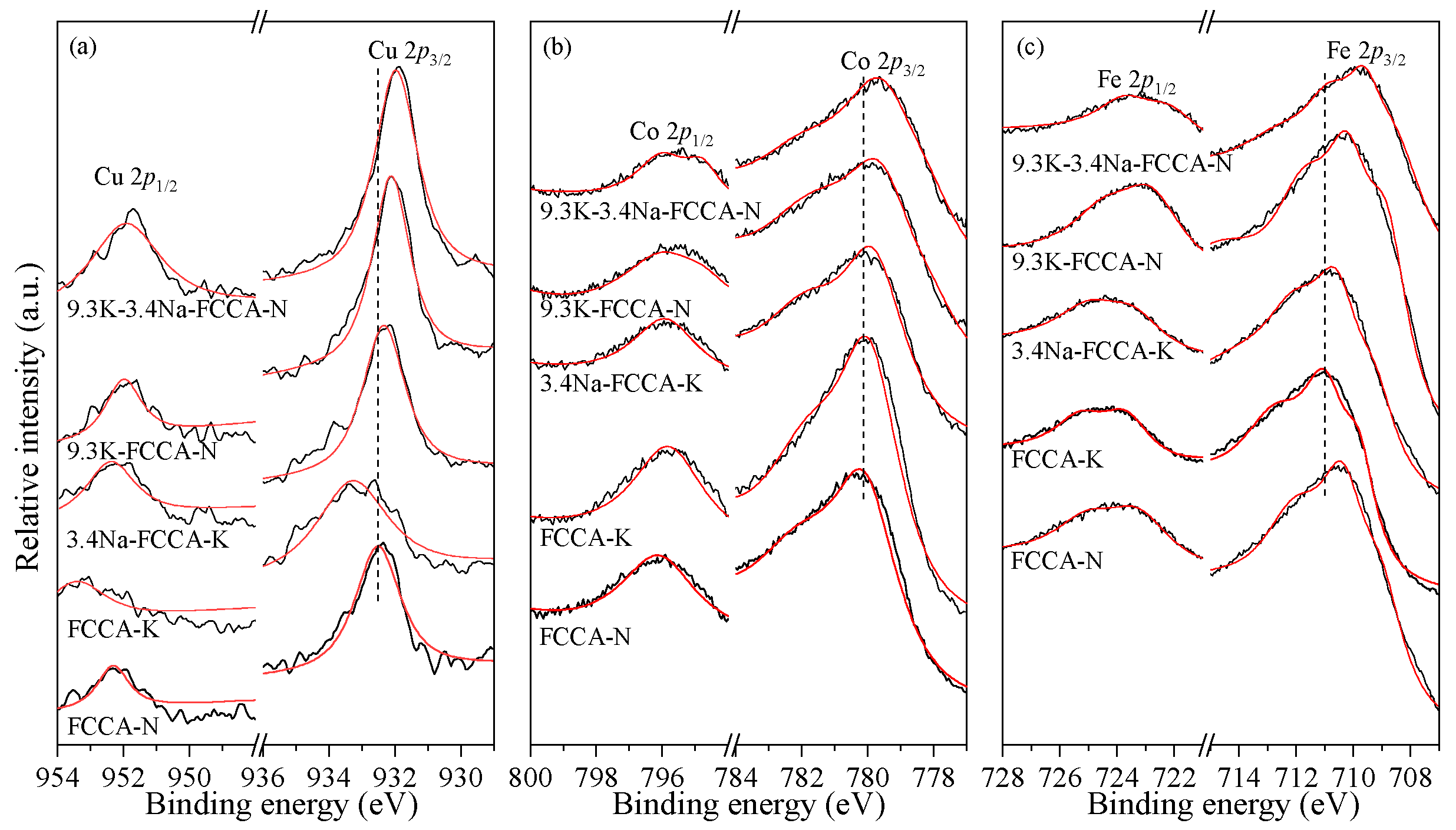 From XPS results (Figure 5) of reduced samples, both FCCA-N and FCCA-K give signals at electron-binding energies of about 932.5 eV, 780.2 eV and 711.2 eV, assigned to Cu 2p3/2, Co 2p3/2 and Fe 2p3/2 [18,30], respectively. Na modification gives rise to a slight decrease in all electron-binding energies of FCCA-K, and K modification leads to an obvious decrease in those of FCCA-N. The simultaneous introduction of K-Na exhibits the biggest shift to a low binding energy value. This is possibly because the introduced alkali metal ions exist in the form of oxides, which can provide more electrons for Fe@Cu or Fe-Co@Cu alloy phase [18,20]. Meanwhile, K ions have a bigger ionic radius than Na, and the corresponding oxides have a stronger capacity to provide electrons [30]. All this evidence indicates that the introduced alkali ions promote the formation of electron-rich metallic active phases in the following order: Na < K < K-Na. This shows that the simultaneous modification of alkali metals K and Na gives a synergistic effect of increasing the electron-rich property of active phase metallic Fe@Cu and Fe-Co@Cu crystals.
