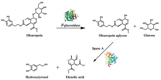 - Liu, M.; Yong, Q.; Yu, S. Efficient bioconversion of oleuropein from olive leaf extract to antioxidant hydroxytyrosol by enzymatic hydrolysis and high-temperature degradation. Biotechnol. Appl. Biochem. 2018, 65, 680–689. [Google Scholar] [CrossRef]