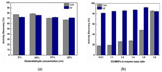 The hydrolytic enzymes bgl and CalA were covalently attached onto the surface of chitosan-functionalized magnetic nanoparticles by employing glutaraldehyde as a crosslinking agent. Several parameters affecting the co-immobilization yield such as the crosslinker concentration, the ratio of CS-MNPs to total enzyme mass, the ratio between bgl and CalA and the incubation time were examined and optimized. It has been reported that glutaraldehyde can directly affect enzyme loading and activity recovery of the enzymes after co-immobilization [,]. Therefore, the effect of glutaraldehyde concentration on enzymes activity recovery was investigated in the range of 5–20% v/v, and the results are presented in Figure 3a. The enzymes activity recovery was determined by measuring the activity of the prepared nanobiocatalyst at different glutaraldehyde concentrations through the enzymatic assay for each enzyme (as described in Section 3.2.5). As it can be seen, at varying glutaraldehyde concentrations, the activity recovery of the enzymes was affected, yielding a maximum activity recovery at 10% v/v crosslinker concentration (79% for CalA and 76% for bgl). At higher or lower glutaraldehyde concentrations, the enzymatic activities were slightly reduced, probably because lower crosslinker concentrations may not be sufficient, while higher concentrations might cause conformational changes leading to a loss of enzymatic activity. These results are in agreement with previously reported studies [,], reporting that significantly low or high glutaraldehyde concentrations lead to insufficient crosslinking of the enzymes, while enzyme activity recoveries tend to increase with increasing crosslinker concentrations up to a maximum value.