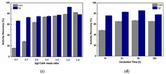 Finally, the effect of incubation time on the activity recovery of the enzymes during co-immobilization was examined, and the results are shown in Figure 3d. As it can be seen, the activity recovery of both enzymes increased with increasing incubation time demonstrating a maximum activity recovery after 5 h of incubation (bgl: 85% and CalA: 66%). Lower time of incubation might not be sufficient for the attachment of enzymes onto MNPs. However, at extended incubation times, a decline in activity recoveries was observed in a similar manner as previously described [,], probably due to rigidification of enzymes that probably affects their configuration, thus leading to abolish enzyme activity.