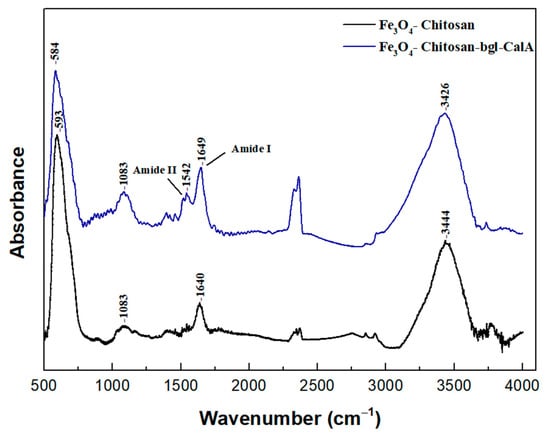 The successful anchoring of bgl and CalA on the CS-MNPs was first confirmed by FTIR spectroscopy. Figure 4 illustrates the FTIR spectra of the CS-MNPs and the co-immobilized form of bgl and CalA. As it can be seen, the bands observed around 590 and 3400 cm−1 can be assigned to Fe-O deformation and O-H stretching vibration of water molecules absorbed on the samples. The peak at 1083 cm−1, present in both spectra, can be attributed to the C-O stretching vibration of glycosidic bonds [], while the peak at 1640 cm−1 is characteristic of the –NH2 bending vibration. Regarding the spectra of Fe3O4-chitosan-bgl-CalA, two absorption bands of a typical protein spectrum are observed. The first absorption around 1649 cm−1 is associated with the Amide I band, which corresponds to the C=O stretching vibrations of amide groups and C=N of imine groups and is directly related to the backbone conformation of the protein []. For this reason, an increase in the absorption around 1640–1649 cm−1 in the Fe3O4-chitosan-bgl-CalA spectrum is observed. The second absorption around 1542 cm−1 is associated with the Amide II band of the proteins, which can be referred to C-N stretching and N-H bending vibration of the amide bond. These bands suggest the crosslink between chitosan and the two enzymes and thus their successful immobilization on CS-MNPs [].