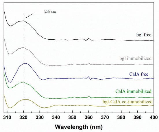 Fluorescence spectroscopy is a widely applied technique for the confirmation of the presence of enzymes on solid material [,,]. The fluorescence emission spectra of free, individually immobilized and co-immobilized form of bgl and CalA were recorded in order to confirm the successful anchoring of the enzymes on the CS-MNPs. Excitation wavelength was set at 280 nm, and the emission intensity was recorded in the range of 300–400 nm. The maximum emission wavelength of the free, individually immobilized and co-immobilized form of both bgl and CalA was found at 320 nm. The fluorescence spectra of CS-MNPs were also recorded at the same conditions, and no emission was observed in the range of 300–400 nm. As it can be seen in Figure 5, in all cases, the fluorescence spectra of bionanoconjugates reveal a maximum emission at 320 nm, which indicates the presence of the enzymes and, therefore, their successful immobilization on the CS-MNPs.