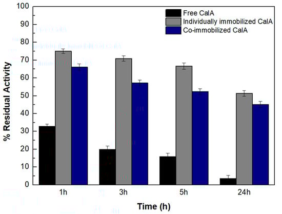 Stability of the free, individually immobilized and co-immobilized form of CalA at 60 °C, in sodium phosphate buffer 50 mM, pH 7.0.