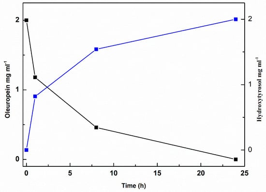 Reaction progress of the hydrolysis of oleuropein by the bi-enzymatic nanobiocatalyst (1 mg mL−1) at different time intervals and the formation of hydroxytyrosol (the standard deviation was less than 5% in all cases).