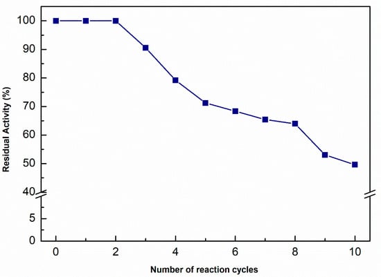 Recycling of multienzymatic nanobiocatalysts is vital in terms of economic viability especially when considering large-scale biocatalytic processes. In the present study, the operational stability of the bi-enzymatic nanobiocatalyst was evaluated for 10 successive reaction cycles of the bioconversion of oleuropein in a batch mode. Each reaction cycle was carried out in citrate phosphate buffer 100 mM pH 6.5 at 60 °C for 24 h. After each cycle, the nanobiocatalyst was separated through magnetization, washed twice with buffer to remove substrate and product remains and then added to fresh oleuropein solution in order to start a new reaction cycle. Figure 8 illustrates the residual activity of the nanobiocatalyst after each cycle. The remaining hydrolytic activity of the magnetic co-immobilized complex is up to 50% after 10 catalytic cycles, which equals about 240 h of constant operation. Similar results have been reported for immobilized CalA onto chitosan-coated magnetic nanoparticles, where the biocatalyst gave half of the initial conversion after 7 reaction cycles [] or for immobilized bgl from Thermotoga maritima on chitin-functionalized magnetic nanoparticles where the nanobiocatalyst presented about 66% of residual activity after 10 reaction cycles []. In the case of co-immobilized enzymes, the conservation up to 75% of residual activity after eight consecutive cycles of a tri-enzyme magnetic nanobiocatalyst [] and the retention of up to 50% after 5 reaction cycles at 50 °C for a four-enzyme magnetic co-immobilized complex have been reported []. Any loss in activity could be attributed to conformational changes on the immobilized enzymes [] or mechanical damage of the biocatalyst during the recycling procedure []. Our results are in good agreement with previously reported studies indicating that multienzyme immobilization on magnetic nanosupports can lead to stable biocatalysts that can be efficiently applied for bioconversions of biotechnological interest, such as the synthesis of hydroxytyrosol from oleuropein.