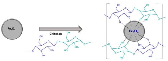 In a typical synthesis protocol, 8 mg of iron oxide magnetic nanoparticles (Fe3O4) was dispersed in 0.96 mL CS solution (0.2% w/v). Figure 9 schematically represents the functionalization of MNPs with chitosan. For the preparation of the chitosan solution 0.2 g of CS powder was dissolved in 100 mL of 1% v/v acetic acid. Then, 0.32 mL of sodium tripolyphosphate solution (1.5 mg mL−1) was added dropwise to the dispersion and mixed under constant magnet stirring (1000 rpm) for 0.5 h at 25 °C. CS-MNPs were subsequently gathered through magnetization (see Supplementary File, Figure S3) and washed thrice with water and ethanol. Finally, the CS-MNPs were dried at 45 °C overnight for further use.