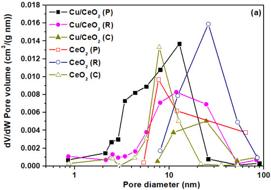 (a) The BJH (Barret-Joyner-Halenda) desorption pore size distribution (PSD) and (b) the adsorption–desorption isotherms of pure CeO2 and CuOx/CeO2 samples of different morphology.