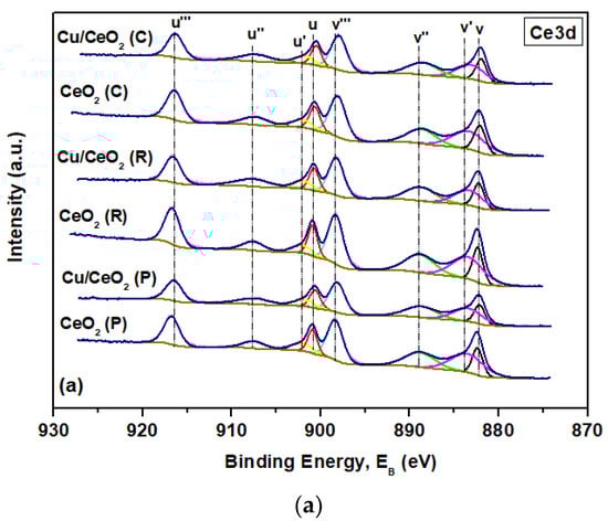 The morphological effect of ceria supports on the surface chemistry of pure CeO2 and CuOx/CeO2 materials was evaluated by XPS analysis. Figure 6a depicts the XPS Ce 3d spectra, deconvoluted into eight components, comprising of the spin-orbit lines u and v, as clearly described in our previous work [27]. In brief, the u lines correspond to Ce 3d3/2, with three peaks: u, u″ and u‴ (at 900.7, 907.6 and 916.4 eV, respectively). The v lines (Ce 3d5/2) include three peaks: v, v″ and v‴ (at 882.2, 888.8, and 898.2 eV, respectively). The above-mentioned six peaks are due to Ce4+, with the two remaining spectral lines (u′ at 902.1 eV and v′ at 883.8 eV) being characteristic of Ce3+ species. The ratio of Ce3+ to total cerium is obtained from the corresponding areas’ ratio [43]. As seen in Table 3, CeO2 (C) shows the lowest population of Ce3+ species, followed by CeO2 (R) and CeO2 (P), confirming the UV-Vis results (vide supra).