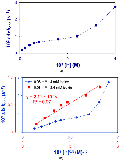 (a) Representative time course graphs at varying concentration of iodide in water. (b) Representative time course graphs at varying ionic strength in 10% (v/v) 1,4-dioxane-water.