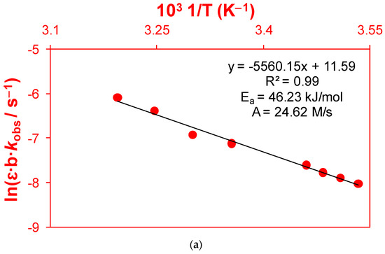 A plot of ln(ɛ∙b∙kobs) was drawn against 1/T that yielded intercept and slope with 99% linear fit (R2 value 0.99), as shown in Figure 6a. The values of A (24.62 M s−1) and Ea (46.23 kJ mol−1) were calculated from the intercept and the slope of the plot, respectively. Meanwhile, a linear plot between ln(ɛ∙b∙kobs/T) and 1/T helped to calculate ΔS# (−226.5 J mol−1 K−1) and ΔH# (43.76 kJ mol−1) from the intercept and the slope of the plot, respectively (Figure 6b). The Gibbs free energy of activation (ΔG#) was also determined by using Equation (35) and found 111.26 kJ mol−1 at 25 °C.