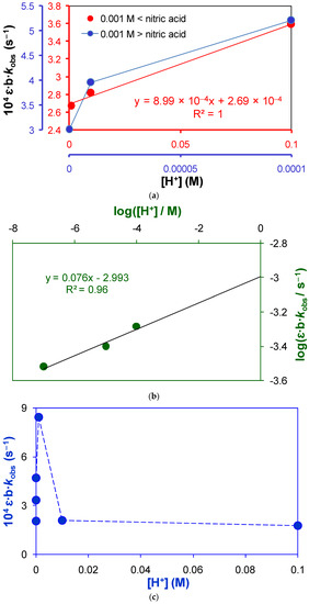 The effect of additional protons such as nitric acid was probed on the observed zero-order rate constant by maintaining all the experimental parameters similar to the uncatalyzed reaction in 10% and 20% (v/v) 1,4-dioxane-water rather than 100% water. The results reveal that raising the concentration of protons has a catalytic effect on the rate constant in both binary solvent media (Figure 8a,c). Within the concentration range of externally injected protons (HNO3), such as 1 mM to 0.1 M (red data in Figure 8a), the value of ɛ∙b∙kobs grew linearly, with an increasing curvature below 1 mM in 10% binary solvent media. The linear plot yields the proton catalyzed rate constant; 8.99 × 10−4 M−1 s−1 (slope) and the proton independent rate constant 2.69 × 10−4 s−1 (intercept). If we divide M−1 s−1 by the dimension of ɛ∙b (M−1 cm−1 cm), the proton catalytic rate constant can be used to identify the first order in proton (H+) throughout the range of 1 mM to 0.1 M. Meanwhile, when the externally injected protons concentration is less than 1 mM, the log–log plot of the rate constant and proton yields a straight line with a 0.076 ‘n’ value, which represents the order of reaction according to Equation (39) (Figure 8b).