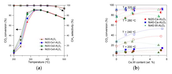 Conversion of carbon dioxide and selectivity towards methane determined at different temperatures in the CO2 methanation reaction in the presence of Ce-promoted Ni20-Al2O3 catalysts are presented in Figure 8a. Thermodynamic constrains are represented here by the dashed lines [21]. The catalysts show high activity at low reaction temperatures. CO2 conversion over Ni20-Al2O3 catalyst approached thermodynamic limit below 350 °C. The drop in CO2 conversion and selectivity to methane was observed above 350 °C. Such effects are consistent with thermodynamic limits [21]. Thermodynamic values of CO2 conversion decreased from around 100% at 200 °C to around 65% at 600 °C (under 2 bar pressure). The catalysts showed excellent selectivity to methane at low reaction temperatures (close to 100%) [21]. The selectivity to CH4 decreased at higher temperatures, in line with the thermodynamics of the CO2 methanation reaction. The only by-product of the reaction was carbon monoxide [21]. An introduction of the small amount of Ce led to the increase in CO2 conversion at low reaction temperatures. Recently, we have demonstrated high durability of unpromoted and Ce-promoted alumina-supported nickel catalysts in time-on-stream of CO2 methanation reaction [12,21]. Figure 8b shows the changes in CO2 conversion at selected temperatures (200, 240, 280, 320 °C) in the presence of catalysts containing different Ni and promoter amounts. An increase in Ce content up to 5 wt % leads to increase in CO2 conversion at low reaction temperatures. An almost linear increase in CO2 conversion with an increase in Ce content up to around 2 wt % was visible at low temperatures for Ni20-Ce-Al2O3 and Ni40-Ce-Al2O3 catalysts. An introduction of larger amounts of Ce led to the less pronounced changes, especially at higher temperatures, 280 and 320 °C, wherein the activity of Ni40-Ce-Al2O3 catalysts was very high. The effects of the presence of tungsten in the catalysts on CO2 conversion were more complex. Although selectivity changes towards methane with an increase in reaction temperature were the same as in the case of unpromoted catalyst, CO2 conversion reached maximum at certain tungsten loading (at low reaction temperatures) (Figure S3 in Supplementary Materials). A maximum of CO2 conversion at different reaction temperatures was attained at 2 wt % of W.
