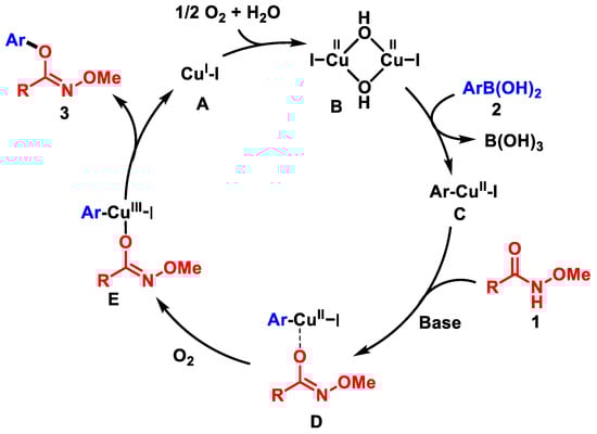 In light of the above results and the previous research [,,,], a plausible reaction mechanism has been proposed (Figure 1). Cu(I) is firstly oxidized into a Cu(II) species B, which then undergoes transmetalation with arylboronic acid 2 to form aryl-Cu(II) intermediate C. Subsequently, N-methoxy amide 1 undergoes H-migration and anion exchange with C to generate Cu(II) complex D under the alkaline conditions. The oxidation of D results in the formation of Cu(III) complex E, which is followed by a reductive elimination to regenerate the Cu(I) catalyst and produce the desired product 3.