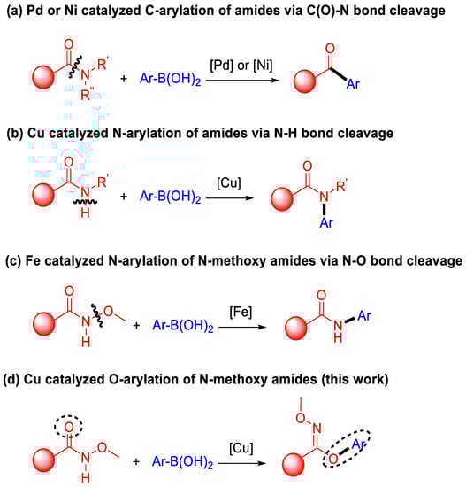 In 1998, Chan and Lam reported the first example of the N/O-arylation of amides using aryl boronic acids as the substrate []. Due to their environmental benefits, functional group tolerance and commercial availability, arylboronic acids have been successfully utilized as arylating reagents for the direct cross-coupling of amides in recent years [,,]. The palladium- and nickel-catalyzed Suzuki–Miyaura coupling of amides via N–C(O) acyl cleavage are representative approaches for C-arylation (Scheme 1a) [,,]. To date, significant progress has been reported in the use of amide derivatives, including N-acetyl-amides [], N-acylsuccinimides [], N, N-di-Boc amides [], and N-acyl-pyrroles [] as cross-coupling partners. Copper-mediated Chan–Lam reactions are an efficient protocol for the N-arylation of amides [,,,], and encouraging results have been obtained for both amides and boronic acid substrates over the past decades (Scheme 1b). In addition to amides, O-protected hydroxamic acids have also been used as an amide source. In 2008, the Liebeskind group [] reported the C-N cross-coupling of O-acetyl hydroxamic acids with arylboronic acids which was promoted by stoichiometric copper. A novel mechanochemical synthesis of N-aryl amides from O-pivaloyl hydroxamic acids and arylboronic acids in the presence of stoichiometric copper has also been developed by the Vilela and Lloyd groups []. Although N-arylation exhibits a high amenability to O-protected hydroxamic acids, the methods for selective O-arylation are noticeably lacking. Thus, the development of new amide precursors that are compatible with various reaction pathways is required to fully exploit the potential of the amides in cross-coupling reactions.