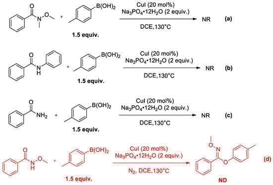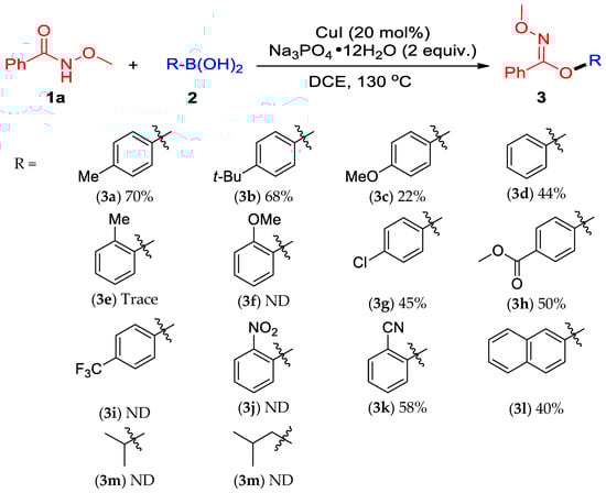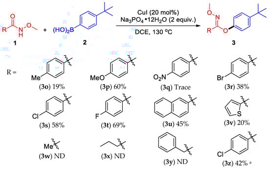 N-methoxy amides scope in copper-catalyzed C-O cross-coupling b,c. a The boronic acid component is p-tolylboronic acid. b Reaction conditions: 1 (0.2 mmol), 2 (1.5 equiv.), CuI (0.2 equiv.), Na3PO4·12H2O (2 equiv.), DCE (2.0 mL), air, 130 °C, 24 h. c Isolated yield based on 1a. ND = Not Detected.