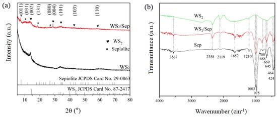 XRD patterns were recorded to examine the phase of the prepared pure WS2 and WS2/Sep composite (Figure 1a). All of the diffraction peaks of both the pure WS2 nanosheets and WS2/Sep composite matched well with the 2H hexagonal phase (JCPDS Card No.87-2417) []. The XRD patterns showed that the main peaks of WS2 of the WS2/Sep were located at 2θ = 13.775°, 28.6989°, 34.248°, and 47.105°, corresponding to the (002), (004), (101), and (103) facets of WS2, and the diffraction peaks at 7.423°, 11.982°, 20.785°, and 26.667° corresponded well to the (011), (031), (131), and (080) facets of the Sep, respectively. The d-spacing value of the composite corresponding to the peak at 13.775° was calculated to be 6.4 Å, which was close to that of the pure WS2. The few broad bread-like peaks could be attributed to the partial crystallization of the WS2 nanosheets. After the solvothermal treatment, WS2 was evenly dispersed on the support, and the diffraction peaks corresponding to WS2 were sharp and symmetric, further confirming the great crystallization of composite. Furthermore, the FT-IR was used to identify the functional groups of the WS2/Sep sample (Figure 1b). The broad absorption peaks at around 3567 cm−1 and 1652 cm−1 were ascribed to the stretching vibration of the hydroxyl group of crystal water. The peaks at 1003, 975, 424, and 788 cm−1 were ascribed to the stretching of the Si-O band in the Si-O-Si groups of sepiolite. The peaks at 669, 688, and 645 cm−1 corresponded to the bending vibration of Mg3OH. The peaks at 464 were attributed to Si-O-Al (octahedral) and Si-O-Si [,,]. The two intensive peaks at around 2358 and 2119 cm−1 originated from the characteristic peaks of hexagonal WS2. The results of XRD and FT-IR revealed the WS2/Sep maintained the original crystal structure and surface functional groups of WS2 and sepiolite.