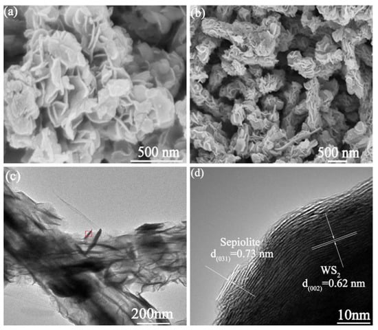 Morphology and structure of the pure WS2 and WS2/sepiolite nanocomposite. (a,b) SEM images of the pure WS2 and WS2/sepiolite nanocomposite obtained via solvothermal; (c,d) TEM and HRTEM images of WS2/Sep.
