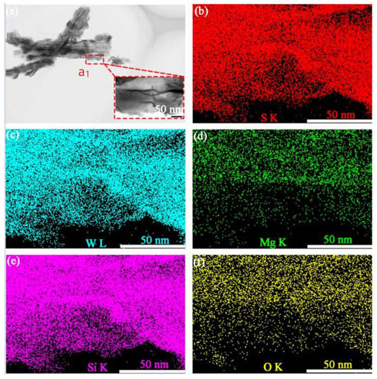 EDS mapping analysis of element distribution (b–f) in marked area (red rectangle in (a)) for the WS2/Sep nanocomposite: S (b), W (c), Mg (d), Si (e), and O (f).