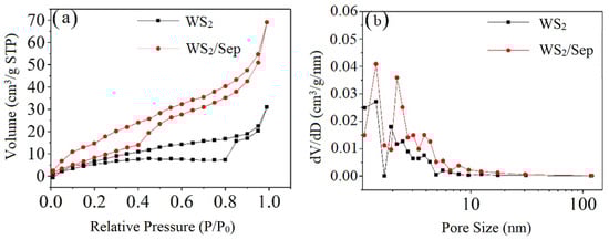 Nitrogen adsorption-desorption isotherms and pore size distribution curves were adopted to further compare the surface area and pore structure between the WS2/Sep composite and pure WS2 (Figure 4). Both the samples presented Langmuir type IV isotherms with H3 hysteresis type loops, suggesting the existence of slit-like mesoporous structures because of the stacking of sheets. This was consistent with the electron microscopy images. The WS2/Sep composite possessed a specific surface area of 45.9 m2/g, which was much larger than that of the pure WS2 (25.3 m2/g). Meanwhile, the pore volume of the WS2/Sep (0.107 cm3/g) was also much larger than that of the WS2 (0.048 cm3/g). Consequently, the composite could expose more surface active sites and increase the number of mesopores, which tended toward improving catalytic activity [].