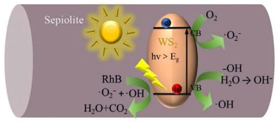 Figure 6 shows the possible process of the photocatalytic RhB degradation in which the synergic effect between the Sep and the grown WS2 in the WS2/sepiolite nanocomposite is illustrated. Under irradiation, the holes (h+) and electrons (e−) were produced. Then, the dissolved O2 would react with e− and OH− would react with h+ to generate superoxide anion radical (·O2−) and hydroxyl radical (·OH), respectively [,]. Finally, the RhB molecules adsorbed on the surface-active sites of the WS2 were degraded to CO2 and H2O [,]. During this process, the excellent adsorption of Sep was conductive to transferring the dissolved O2 and RhB molecules to the active sites of the WS2, and the abundant hydroxyl (–OH) groups on the Sep surface also benefited the production of ·OH [,,]. Thus, in addition to the improved dispersion of WS2, the synergic effects provided by the Sep during photocatalysis also enabled the WS2/Sep composite to exhibit much higher photocatalytic activity than the pure WS2 []. Furthermore, the presence of mesopores favored multilight scattering, resulting in enhanced harvesting of the exciting light, and accordingly, improved photocatalytic activity [,]. These mesopores also facilitated fast mass transport and thus enhanced the performance [,].