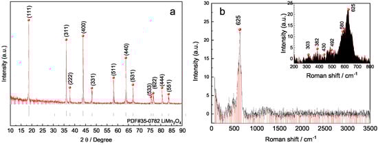 XRD pattern of the LMO (a) and Raman spectra (b).