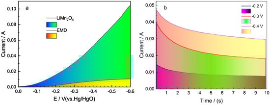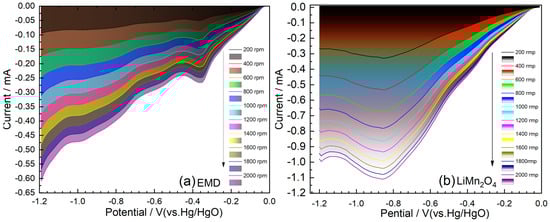LSV graphs with a GC disc in the O-saturated 6 M KOH solution; (a) EMD and (b) LMO; scan rate of 5 mv·s−1.