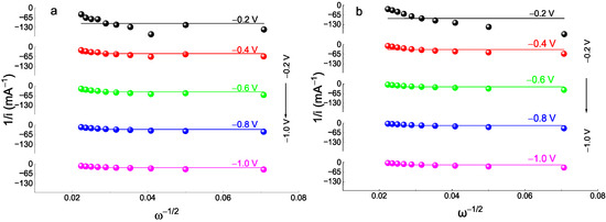 where i, i, and i represent the measured, diffusion-limiting, and kinetic current density, respectively, and  is the electrode’s rotational rate. B can be determined from the Levich equation as follows: B = 0.62nFACDv, where n represents the number of electrons, F is the Faraday constant (F = 96,485 C·mol−1), C is the saturated O concentration (1.21 × 10−6 mol·cm−3), D is the diffusion coefficient of O2 in 6.0 M KOH (1.75 × 10−5 cm2 s−1),  is the kinetic viscosity (0.01 cm2·s−1) [], K (M−1·s−1) is the kinetic rate constant for the catalytic reaction, and  (mol·cm−2) is the amount of catalysts on the surface of the electrode. The constant 0.62 is adopted when the rotation speed is expressed in rpm. From Equation (4), there is a line relationship between i−1 and , where B and i are the slope and intercept of the line, respectively. Thus, it is necessary to extract the corresponding information from the LSV result of RDE and to make related line fittings; the Koutecky–Levich plots and fitting lines are shown in Figure 7. It can be calculated that the ORR at the LMO/Nafion-modified electrode is a four-electron process.