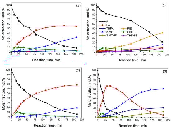 Dependence of the distribution of the reagent and product concentrations on the reaction time for furfural hydrogenation over (a) Ni0.1MoC-SiO2, (b) Ni0.1MoC/SiO2, (c) Ni0.1MoC/Al2O3, and (d) Ni0.1MoC/C catalysts under the following reaction conditions: T = 150 °C, P = 6.0 MPa, mcat = 1.0 g, and furfural concentration in solution with isopropanol equal to 3.5 vol.%. Abbreviations: F—furfural; FA—furfuryl alcohol; 2-MF—2-methylfuran; 2-MTHF—2-methyltetrahydrofuran; THFA—tetrahydrofurfuryl alcohol; FHIE—furfuryl-hydroxyl-isopropyl ether; FIE—furfuryl isopropyl ether; THFHIE—tetrahydrofurfuryl hydroxyl isopropyl ether.