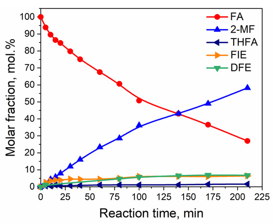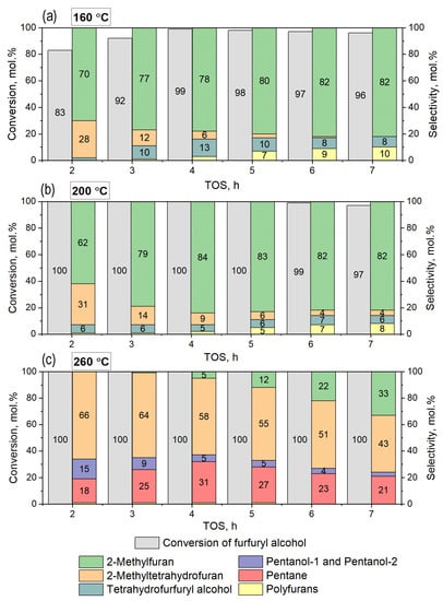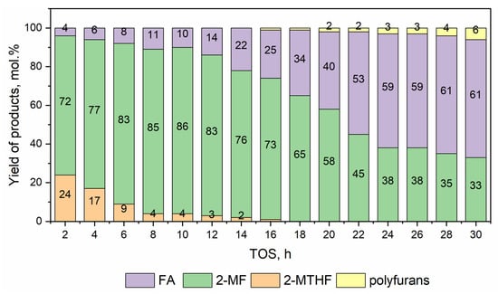 At temperatures of 160 °C, the initial conversion was 83 mol.% and increased to 99 mol.% at 4 h of the reaction, followed by a decrease in the conversion to 96 mol.% at 7 h of TOS. This dependence could be related to the additional activation of the metallic active component during the beginning of the reaction under high-pressure hydrogen, with subsequent deactivation of the catalyst due to the formation of polyfurans. For example, the yield of the condensation products of two furanic molecules reached up to 9.6 mol.% in the reaction mixture after 7 h of TOS. The main product was 2-MF with the selectivity of the formation of 82 mol.% after 7 h of TOS. During the reaction, a decrease in the selectivity of 2-MTHF from 28 mol.% to zero was observed, which also confirmed the catalyst’s deactivation. The selectivity of the THFA formation was kept the same during TOS (6 mol.%).
