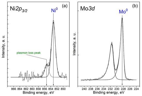 The intense peak at 853.1 eV and a low-intensity peak of plasmon losses were observed in the spectrum for Ni2p3/2. The binding energy (853.1 eV) and the shape of the spectrum correspond to nickel in the metallic state [,]. In the spectrum of Mo3d, there is only one doublet Mo3d5/2-Mo3d3/2 with a binding energy in the region of 228.4 eV, which corresponds to Mo0 []. Nevertheless, it was hardly possible to distinguish molybdenum in the form of a metal or carbide on the basis of the XPS data. It is most likely that Mo presented as a carbide, in accordance with the XRD and TEM results.