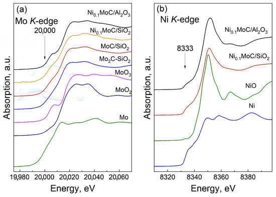 Since XRD analysis is unable to detect molybdenum carbide or nickel spaces in the case of samples supported with alumina and silica, the XANES and EXAFS methods were used to characterize the Ni0.1MoC/Al2O3 and Ni0.1MoC/SiO2 catalysts. Figure 6 presents XANES spectra for the samples obtained based on reference samples and Ni and Mo.
