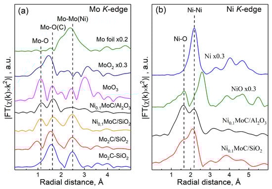 The EXAFS Fourier transforms of the K-edge Mo (a) and Ni (b) of the studied samples are shown in Figure 7. For the Ni0.1Mo/Al2O3, Ni0.1Mo/SiO2, and Mo2C/SiO2 samples, peaks in the regions of 1.1 Å and 1.6 Å were observed that corresponded to the Mo–O distances for MoO3. This indicates that there was no local ordering beyond 3 Å in the samples under study, i.e., molybdenum oxide was probably in an amorphous state, either in the form of a thin film or in a highly dispersed state. Obtained data confirmed the presence of amorphous MoO3 on the SiO2, providing more available Lewis acid sites on the catalyst, and promoting the esterification reaction. A peak at 2.5 Å (for metallic molybdenum) was observed in the EXAFS curves of the Ni0.1Mo/SiO2 and Mo2C/SiO2 samples, as well as Mo2C-SiO2. Taking into account the results of the analysis of the XANES spectra, it can be argued that, on the EXAFS curves of the studied Ni0.1Mo/SiO2 and Mo2C/SiO2 samples, the main contribution to the peak at 2.5 Å comes from the Mo–Mo scattering paths in the Mo2C structure. In the curve of the Ni0.1Mo/Al2O3 sample, the peak at 2.5 Å, related to the Mo–Mo distance, is of low intensity; therefore, the molybdenum carbide was present in a highly disordered form.