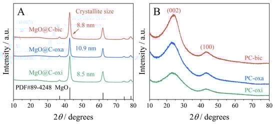 Figure 1A shows the XRD patterns of the MgO@C-n (n = bic, oxa and oxi) composites, showing that after 4 h of carbonization at 700 °C in N2 flow, all the magnesium salts are decomposed to MgO. The diffraction peaks at 37°, 43°, 62°, 75° and 79° correspond to the (111), (200), (220), (311) and (222) planes of MgO, respectively. The crystallite sizes of MgO@C-bic, MgO@C-oxa and MgO@C-oxi, calculated with the Scherrer equation, are 8.8 nm, 10.9 nm and 8.5 nm, respectively. MgO@C-oxa shows a slightly larger crystallite size than MgO@C-bic, which could be because the MgC2O4 is directly decomposed into MgO (one-step process), while the decomposition of Mg(HCO3)2 undergoes a two-step process (e.g., Mg(HCO3)2 = MgCO3 + H2O, MgCO3 = MgO + CO2), as observed in the TGA profiles below. Hence, the MgO particles decomposed from MgC2O4 are more facile to aggregate during the carbonization process. No diffraction peaks attributable to carbon are observed in the XRD patterns due to its amorphous phase and low content of carbon, as suggested elsewhere [].