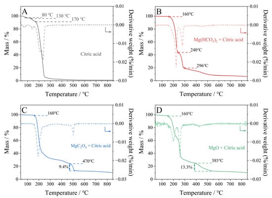For the citric acid and MgO mixture, the first dehydration stage of citric acid is not clearly observed, see Figure 2B, which could be because the weight loss is too small to be detected (due to the presence of MgO) and most of the water may be absorbed by MgO, forming Mg(OH)2. This phenomenon also happens to citric acid mixed with Mg(HCO3)2 and MgC2O4 (Figure 2B,C). For similar reasons, although the second dehydration stage appears (due to the continuous release of water), the temperature is postponed to 160 °C. According to the DTG curves, this interval consists of two steps: the decomposition of citric acid, and the loss of magnesium salt crystal water or the partial decomposition of anions (e.g., OH−). As the temperature increases, the weight loss of the magnesium precursors, as well as the carbonization of citric acid, appear. As expected, the weight loss of the “Mg(HCO3)2 + citric acid” mixture is in a wide range, compared to that of the “MgC2O4 + citric acid” mixture, since the decomposition of Mg(HCO3)2 is a two-step process and that of MgC2O4 is a one-step process.