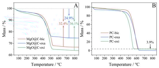 TGA profiles of (A) the MgO@C composites and (B) the PCs conducted in air atmosphere.