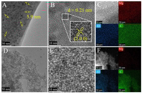TEM images of (A,B) MgO@C-bic and (D,E) PC-bic, and STEM elemental mapping of the Mg, O and C atoms of (C) MgO@C-bic and (F) PC-bic.