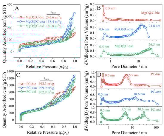 N2 physisorption isotherms are conducted to evaluate the textural properties of the MgO@C composites and the PCs. For the isotherms (Figure 5A,C), a sharp increase in N2 adsorption at p/p0 < 0.05 is observed for all materials, which implies the presence of micropores that originate from porous carbon. The variation in isothermal shape at p/p0 = 0.4~0.99 indicates that different pore structures are formed depending on the magnesium salts, which have varied decomposition behaviors. The large increase in N2 adsorption quantity, from the MgO@C to the PC, indicates that new pores are created and/or blocks in the pores are removed after being treated with HCl solution. This also implies that the MgO particles are etched from the composites, leaving pores in the PCs. By comparison, the MgO@C-oxa exhibits the lowest surface area, which could be due to its larger MgO particle size and, in particular, low carbon content, as seen from the XRD and TGA results.