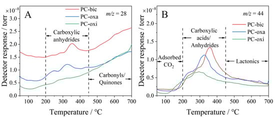 Figure 6A,B depicts the MS spectra monitored for CO and CO2 (which for H2O can be found in Figure S2). Generally, two desorption regions can be classified for CO-TPD, with the first at 200~450 °C assignable to CO decomposed from carboxylic anhydrides groups, and the second at above 450 °C to the decomposition of carbonyls or quinones []. By comparison, the PC-bic shows a larger desorption peak area and higher desorption temperature than the others, indicating that PC-bic has more surface carboxylic anhydrides groups.