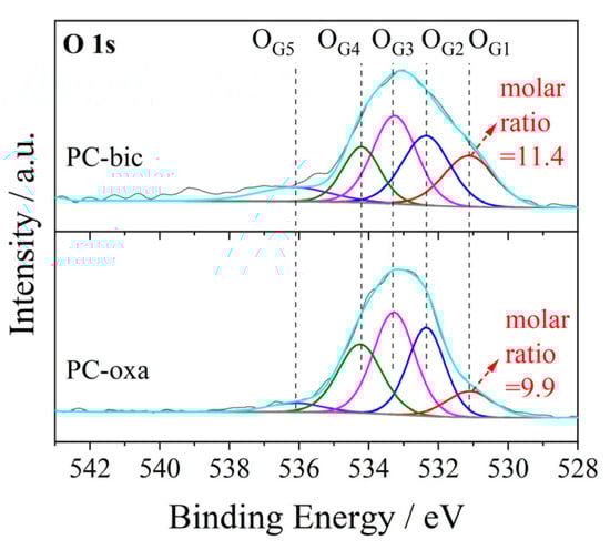 To confirm and clarify the SOFGs generated on the PCs, we perform the O 1s XPS spectra for the materials and show the results in Figure 7. According to the literature [,], five peaks can be fitted for the spectra, with the first at 531.3 eV (OG1) attributed to the carbonyl oxygen atoms of ketone; the second at 532.3 eV (OG2) which relates to the carbonyl oxygen in esters and anhydrides, or the oxygen in hydroxyls or ethers; the third at 533.2 eV (OG3) which corresponds to the ether oxygen atoms in esters or anhydrides; the fourth at 534.4 eV (OG4) attributed to the carboxylic oxygen, and the last at 536.3–536.8 eV (OG5) which relates to the oxygen of the adsorbed water. This supports the above results and confirms that the SOFGs of ketones, esters, anhydrides and carboxylic acid are generated on the PCs. In addition, it was found that the molar ratio of OG1 for PC-bic (11.4) is higher than that for PC-oxa (9.9), which indicates a larger content of carbonyl groups from ketones and explains the significant discrepancy between PC-bic and PC-oxa observed at the 200~450 °C region of the TPD profiles.