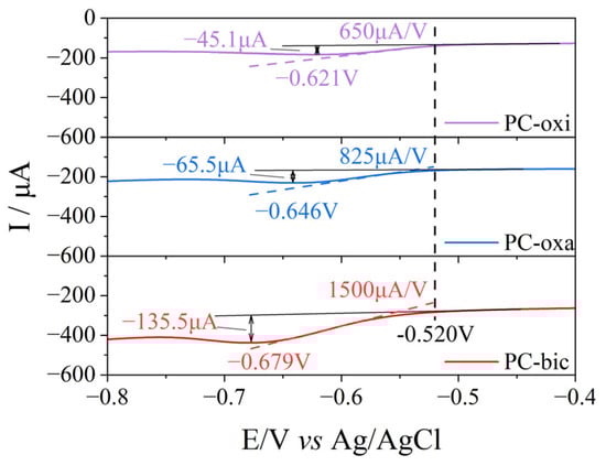Table 1 lists the current, current density and potential of 4-NP reduction peaks obtained from the PCs. The peak current increases from −45.1 μA for PC-oxi to −65.5 μA for PC-oxa and further to −135.5 μA for PC-bic (the corresponding CV curves can be found in Figure S4B). Because of the large increase in the CV current, the potentials associated with the 4-NP reduction peak are slightly postponed, from −0.621 V to −0.646 V and to −0.679 V. Whereas the potential to initiate the reduction of 4-NP is similar for all the PCs, see Figure 8, indicating that they have similar electrocatalytic reduction ability. On the other hand, from the reduction peak slope, which reflects the rate of the reduction reaction, it was seen that the PC-bic had a slope of 1500 μA V−1, which is 2.3 times larger than that of PC-oxi. This demonstrates that the electroreduction of 4-NP is more facilitated over the PC-bic. Moreover, the electrocatalytic activity of PC-bic is compared with the other electrocatalysts reported in the literature (Table S1). The electrocatalytic activity of PC-bic is preferable to metal oxide, graphitic carbon nitride, graphene oxide or the composites of metal oxides and nanosheets [,,,,,]. By comparing the 4-NP reduction peak currents, it reveals that PC-bic has the higher peak current density than that of Cu-curcumin and PC-c, indicating the superior electrocatalytic reduction performance of PC-bic.