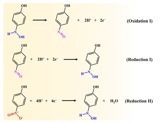 - Shi, Q.; Chen, M.; Diao, G. Electrocatalytical reduction of m-nitrophenol on reduced graphene oxide modified glassy carbon electrode. Electrochim. Acta 2013, 114, 693–699. [Google Scholar] [CrossRef]