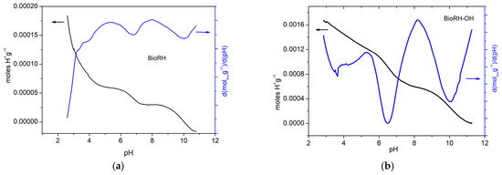 Figure 6 shows the proton consumption on the surface of each biochar sample studied (black lines) upon potentiometric titration experiments, calculated from data presented in Figure S2. Differentiation of these curves (Figure 6, blue lines) reveals the relevant analogy between strong, moderate, and weak acid sites [34]. The area of the inverse peaks in the pH ranges lower than 4, between 4 and 7, and higher than 7 could be taken as a measure of the strong, moderate, and weak acid sites, respectively [34]. Inspection of Figure 6 shows that the relevant population of acid sites with various strength depends on the post-treatment performed. More precisely, (a) the untreated biochar exhibits mainly strong acid sites; (b) these sites have been diminished after alkali post-treatment, making the moderate and weak acid sites predominant; (c) the population of weak acid sites increases considerably after acidic post-treatment of BioRH; (d) strong and moderate acid sites become predominant after successive alkali and acid post-treatment; and (e) in contrast to the latter, successive acid and alkali post-treatment results in enhancement of moderate and weak acid sites, presenting a similar profile as that obtained after a single alkali post-treatment.
