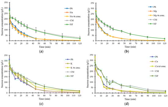 Furthermore, in comparison to one of our previous studies, it was also shown that the previous positive effects of NF on the hydrolysis rate were no longer profound [14]. This can be explained by the high buffering capacity of the molasses, where the initial pH was previously not adjusted and was approx. pH 9. The pH dropped more for the NF than the CM, since NF molasses contains fewer salts than CM, which approached more optimal pH ranges for the invertase enzyme [14]. As Figure 1 shows, there was no difference in the hydrolysis rate of sucrose in the NF or CM when the reaction was carried out under the optimum pH (4.5). This means that the previous positive effects of nanofiltration on molasses were possibly just a change in buffering capacity. Section 3.3 shows further the effects of the inorganic low-molecular-weight compounds present in the molasses.
