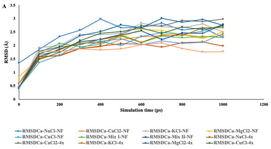 Attempting to understand the molecular interactions and potential inhibitory effects of some salts on the activity of invertase, computational investigations of the crystal structure of the enzyme were conducted. Initially, the octamer structure of the invertase derived from Saccharomyces cerevisiae was used in its entirety in the MD simulation studies, due to the importance of dimerization of dimerization in determining the substrate specificity and stability of the enzyme [40]. Overall, no significant deviation of the structure was observed (Figure S3), even in the presence of high concentrations of the salts and with a prolonged simulation time. However, certain salts were found to have the same effect at low and high concentrations (i.e., KCl, Mix I), whereas most of the salts increased the deviation of the structure at four times higher concentrations (CaCl2, MgCl2, CuCl). Surprisingly, NaCl and Mix II lowered the deviation of the structure at higher concentrations, which might be a result of increasing the rigidity of the structure at high concentrations of the salts rather than unfolding of the protein (Figure 7A,B). The most significant effect was observed with 7.25 g/L of NaCl (NF molasses concentration), followed by MgCl2, KCl, and CaCl2 at four times the baseline concentration.